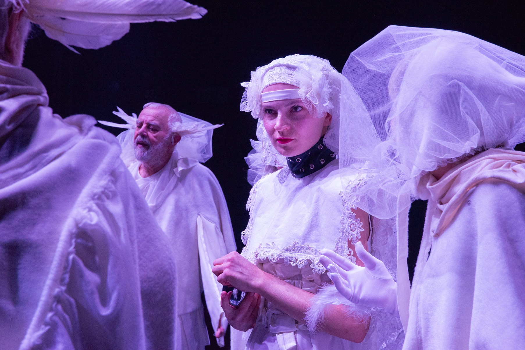 Šimona: From the beginning of rehearsals, we worked with gestures, which I think intuitively led us to contrast. As inspiration, the directing tandem chose one contemporary pop singer for each of us to accompany our individual characters, which naturally gave us each a different energy. I think our portrayal of Jane is a combination of the contrasts between each of us and a shared intense presence, which creates the impression of a single character.